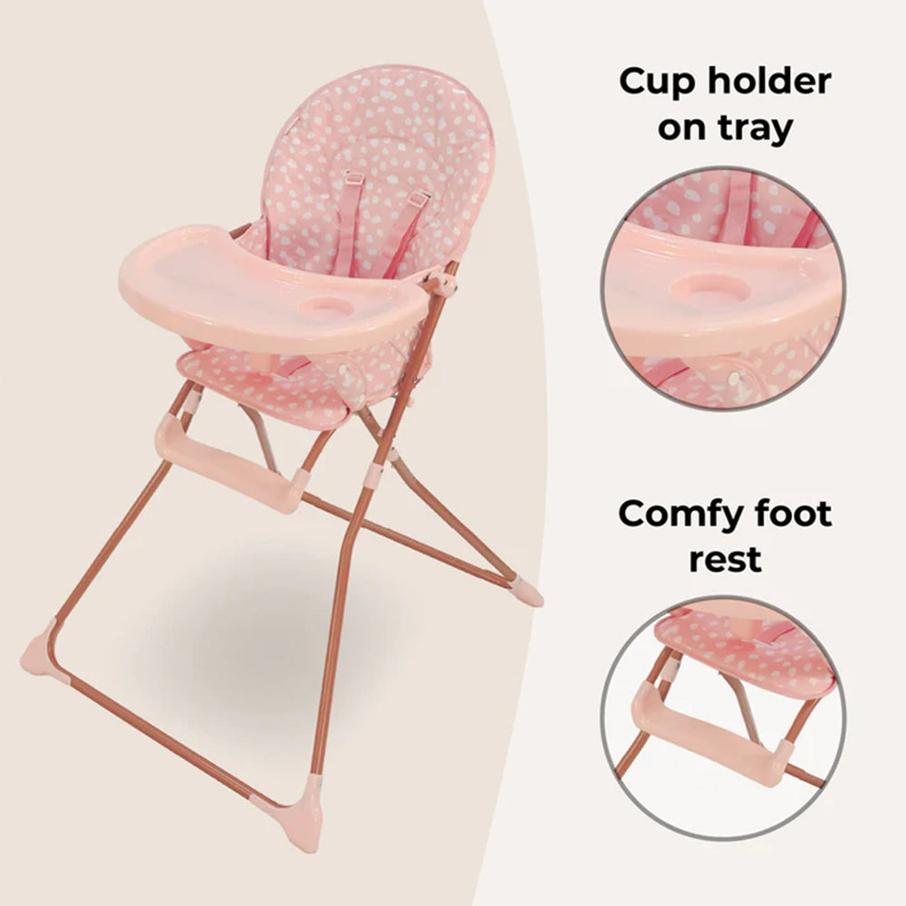 This cute highchair is ultra lightweight and suitable for any occasion. The padded seat with a five-point harness not only looks great but is super comfy and can be wiped clean easily after use. On the tray is a handy cup holder and a foot rest means your little one is comfy for mealtimes. After use, this highchair can be folded and stored out the way with ease.