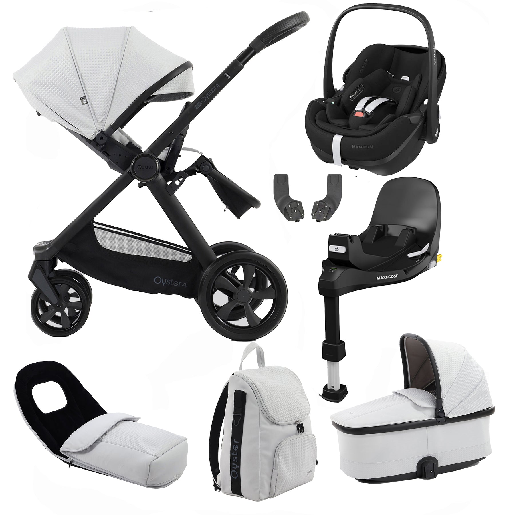 The Oyster4 can be transformed into 19 different configurations to fit your specific needs. It is compatible with the Oyster Carrycot, Capsule Infant Car Seat, and Oyster Basket (up to 9kg). For older children up to 20kg, the Oyster4 Stroller can also be used with the Ride-on Board.